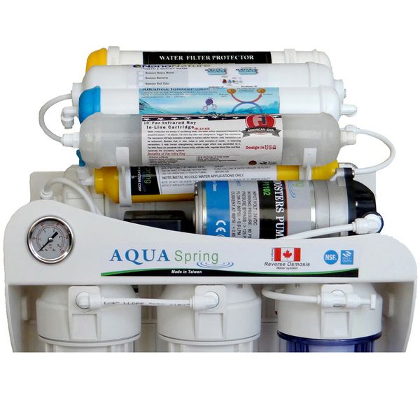 دستگاه تصفیهآب خانگی با برند معتبر اکوآاسپرینگ ده مرحلهای و دارای باکیفیتترین و بروزتری ده مرحلهای و دارای باکیفیتترین و بروزترین تکنولوژی در فرایند دستگاههای تصفیهآب خانگی است. در این دستگاه از متریال و هوزینگهای فودگرید، فیلترهایی برپایه گیاهی، مخزن آنتیباکتریال 16 لیتری، مگابوستر پمپ قوی بافشار 125 PSI و شیر جداگانه برخوردار است. عملکرد فیلترهای این دستگاه در سهمرحله اول بهاینصورت است که کلیه املاح معلق و مضر، کلر، آفتکشها و شوری را از آب گرفته و درمرحله بعد نیترات، نیتریت، جیوه و میکروارگانیسمهای شیمیایی و فلزات سنگین (کلیه املاح سرطان زا) را بهطور کامل از آب میگیرد. کیت نشتی تصفیه آب ابزاری کوچک و بسیار کاربردی در استفاده از دستگاه های تصفیه آب خانگی میباشد .کیت LEAK DETECTOR ساخت شرکت فلاکستک تایوان و دارای قرص های بسیار حساس نسبت به آب و رطوبت بوده که به محض نشتی دستگاه تصفیه آب جریان ورودی آب را قطع می نماید تا از خسارت و نشت آب جلوگیری کند. فیلتر نانو استفاده شده در این دستگاه از ذرات 100% گیاهی تشکیل شده،گیاهان به دلیل داشتن خواص آنتی اکسیدانی بالا ، متابولیت ثانویه بالا و استحکام بالا در برابر مواد شیمیایی نقش بسزایی جهت از بین بردن میکروبها و ویروسها دارند. دستگاه فوق دارای فیلتر اکسیژن ساز میباشد که به وسیله سنگهای بیوسرامیک و شکست مولکولی آب سطح میزان اکسیژن آب را افزایش میدهد. در این دستگاه از مرغوب ترین فیلتر قلیایی ساز(یونایزر) استفاده شده است. این فیلتر با استفاده از فرآیند الکترولیز اجزای اسیدی و قلیایی آب را جدا میکند تا PH آب را افزایش دهد. در مطالعات اخیر اثبات شده است که نوشیدن آب قلیایی موجب سلامت پوست و مو ، بهبود عملکرد روده ، کبد و سیستم ایمنی بدن ،سم زدایی بدن ، کاهش وزن، کاهش قند خون در افراد دیابتی و … خواهد شد. دستگاه فوق دارای شیر مجزا، مخزن ذخیره مجزای آنتی باکتریال می باشد که از بهترین و معتبرترین دستگاه های ارائه شده در بازار است. کلیه محصولات نشانگر کیفیت و سلامت محصول اروپا را دارا می باشند و استانداردهای NSF – ISO – FDA – WATER QUALITY – CE را کسب نموده است.